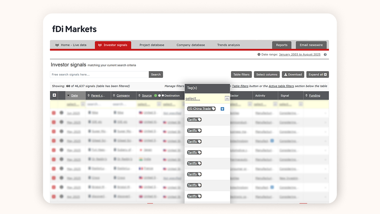 In August, fDi Markets released their latest feature which now identifies projects and signals which have been announced in response to a government-imposed tariff on goods and services affecting the investor’s supply chain or market access. With the reciprocal tariff calculations focusing heavily on imposing tariffs on countries importing goods to the US, fDi Markets recorded an exponential increase in companies both signalling and confirming investment into the US.